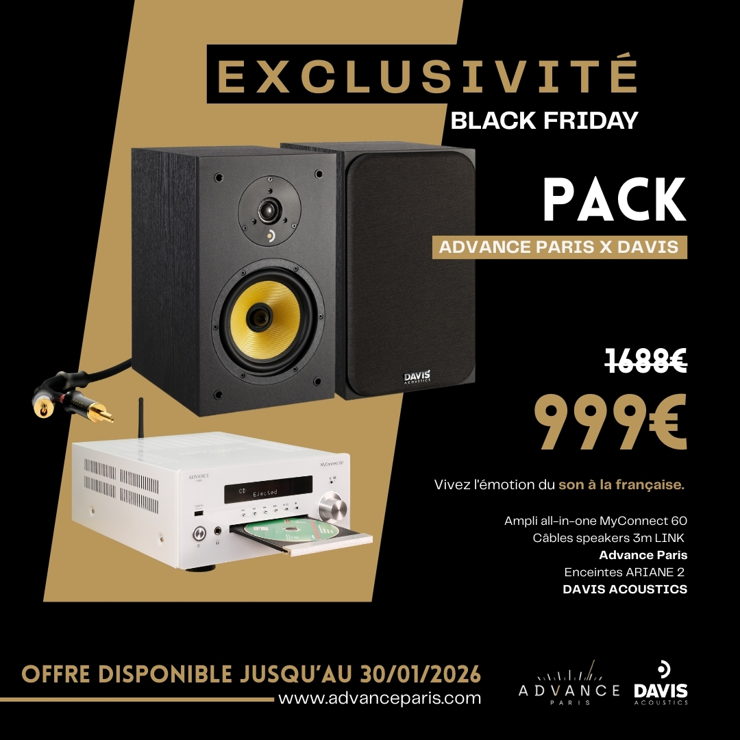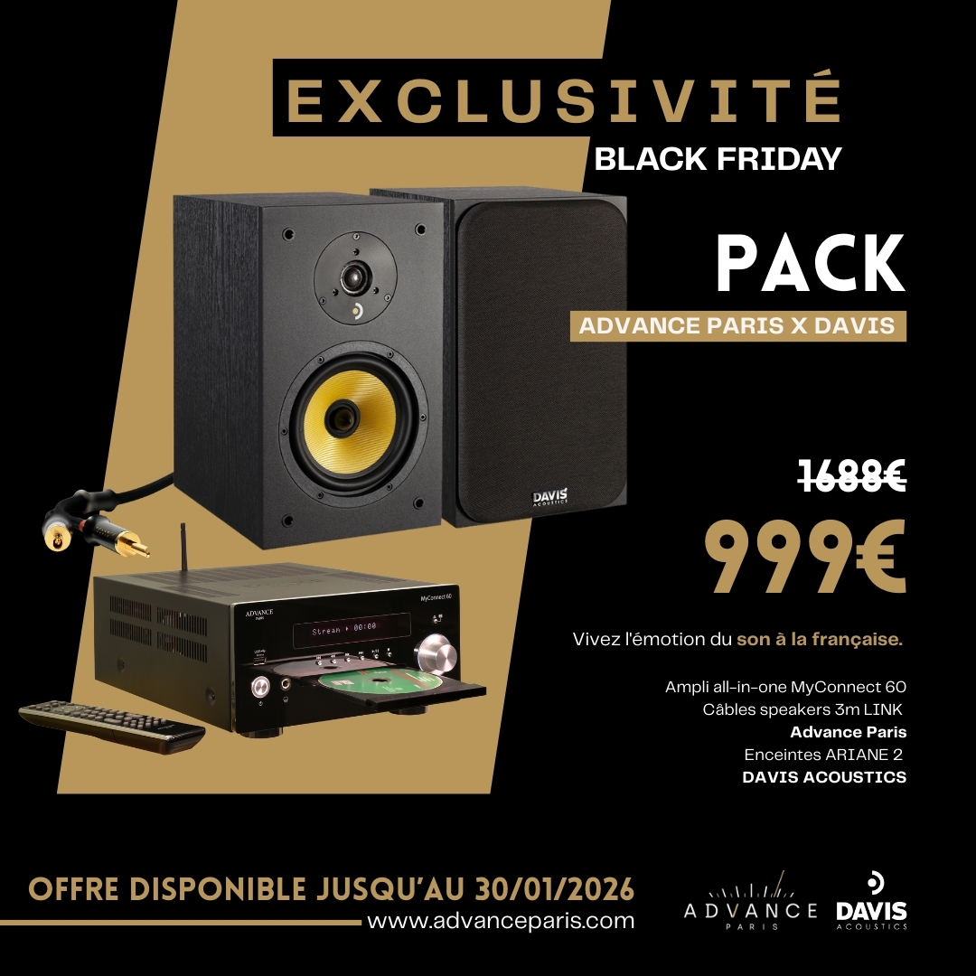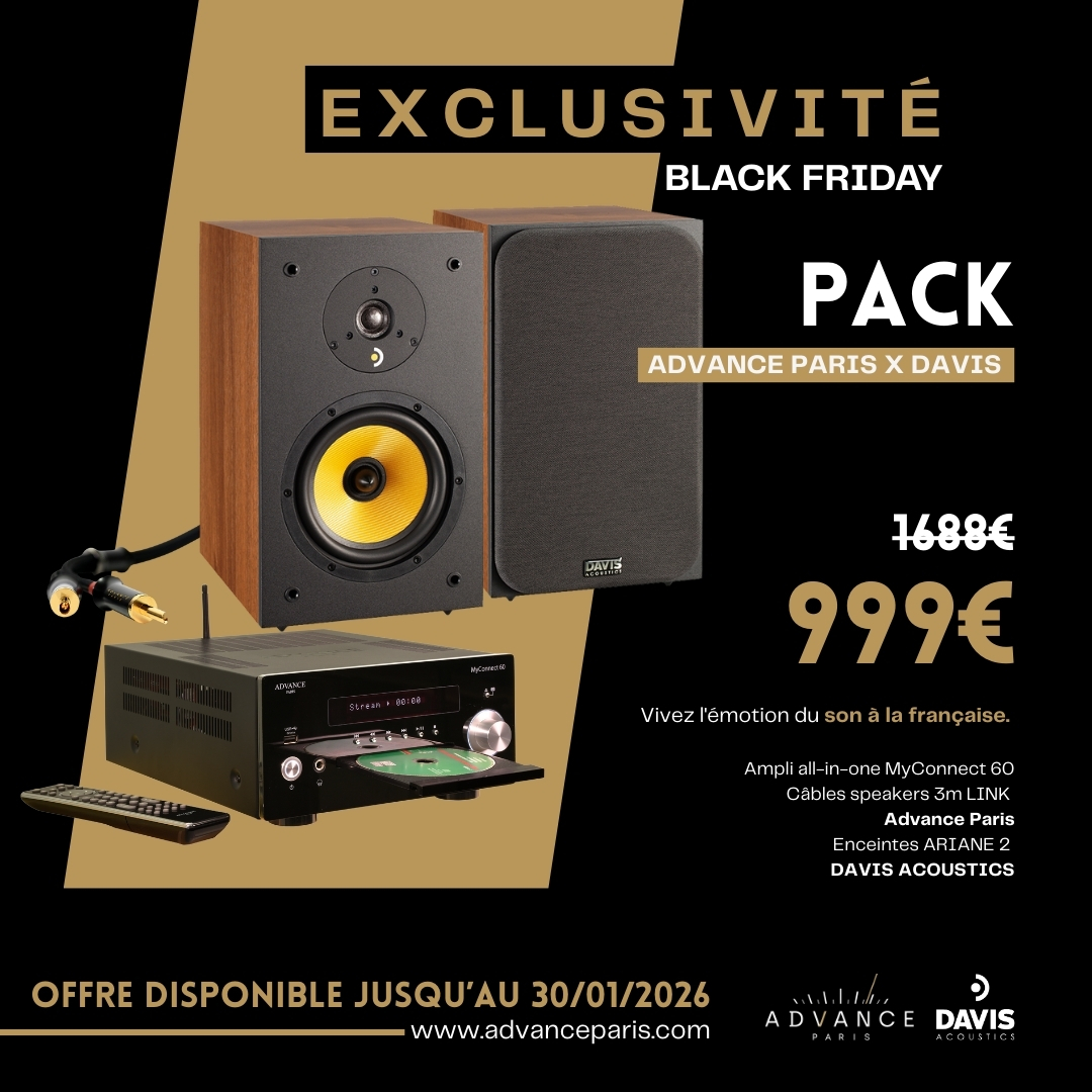 Vente 41%Pack composé d’un amplificateur Tout-en-Un MyConnect 60 (choix de couleur :  blanc ou noir), d’une paire de DAVIS Ariane 2 (choix de couleur : noir ou noyer) et d’une paire de câbles d’enceintes Speaker de 3 mètres de la gamme LINK.